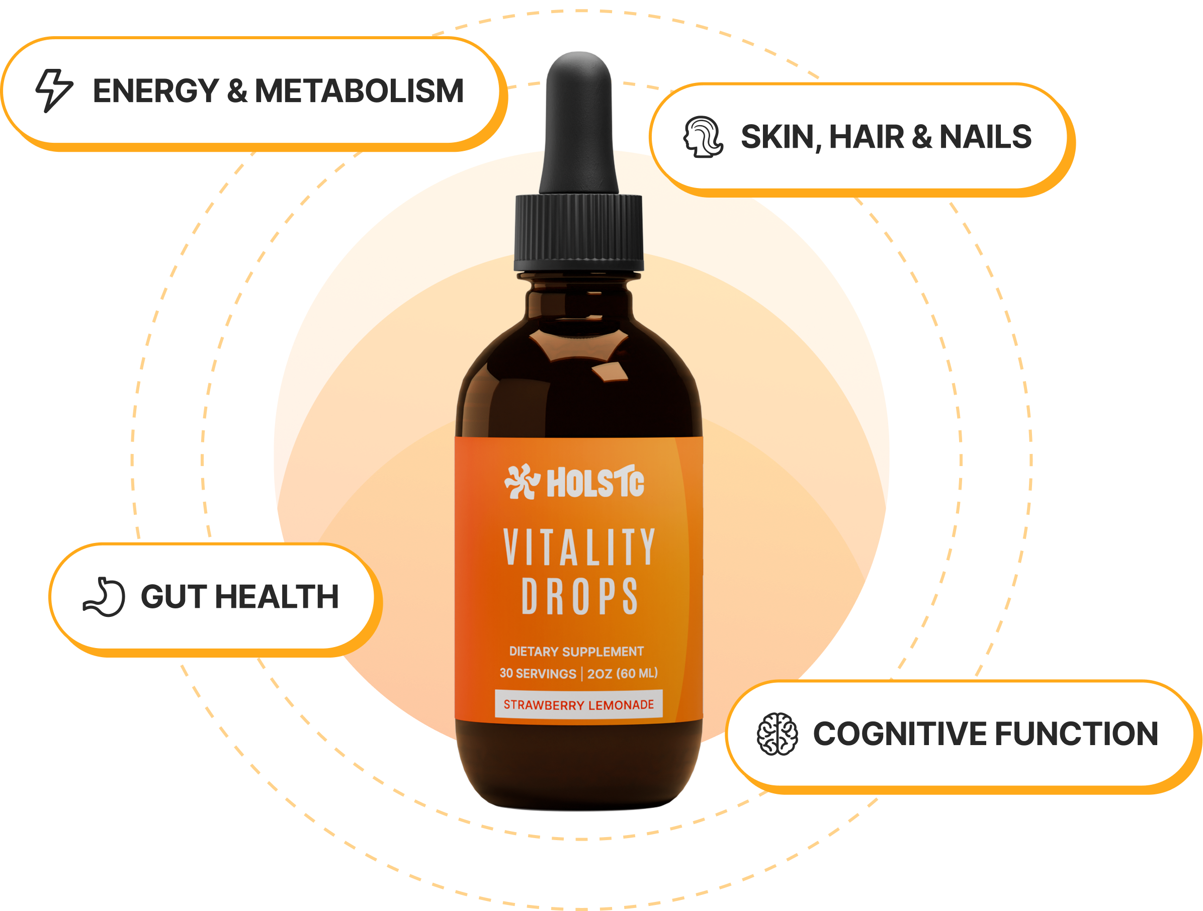 HOLSTC Vitality Drops are a concentrated blend of essential vitamins and minerals designed to fuel your body and support wellness from within. This all-in-one liquid formula delivers broad-spectrum nutritional support in a highly absorbable form—perfect for daily use.